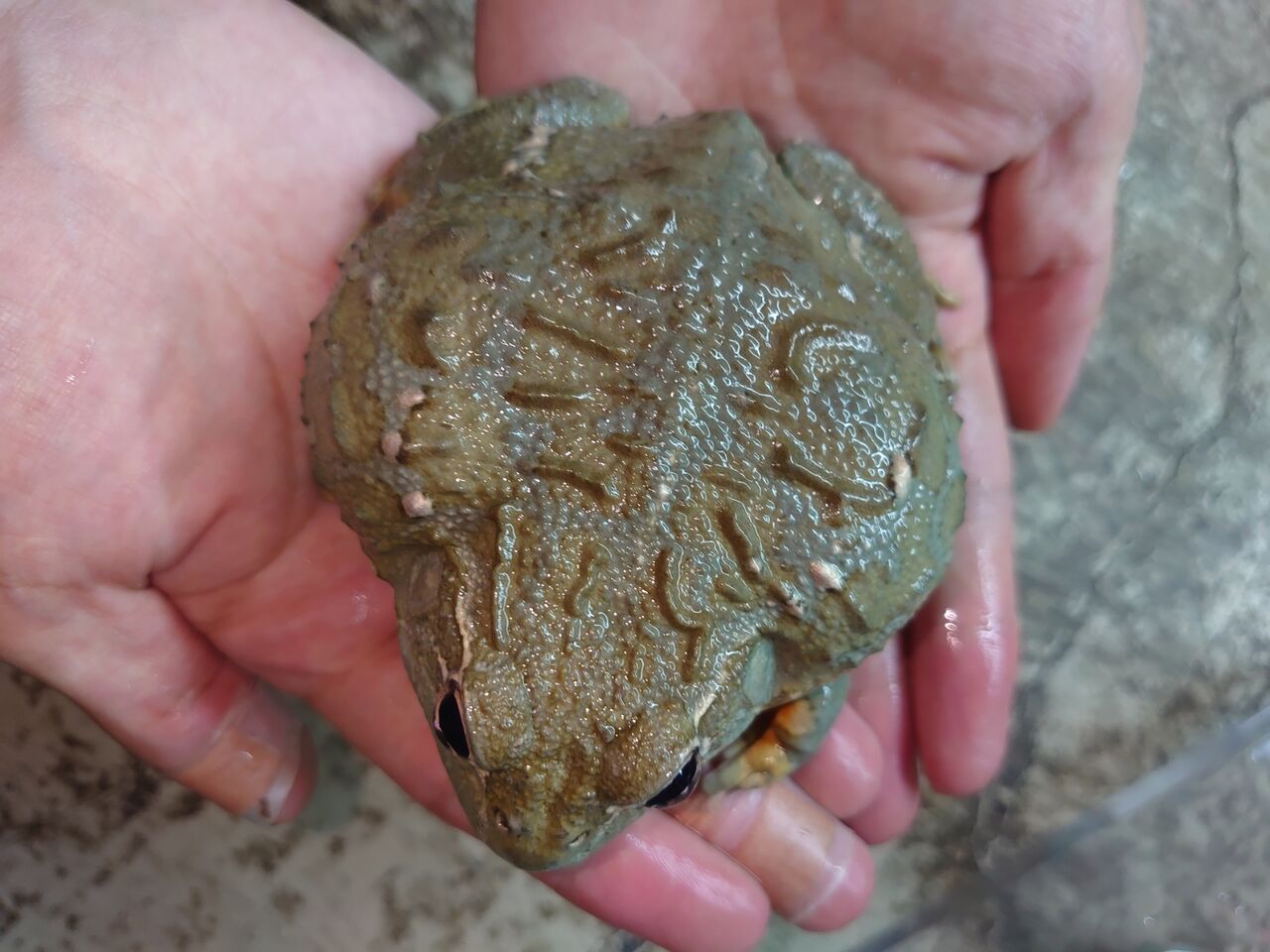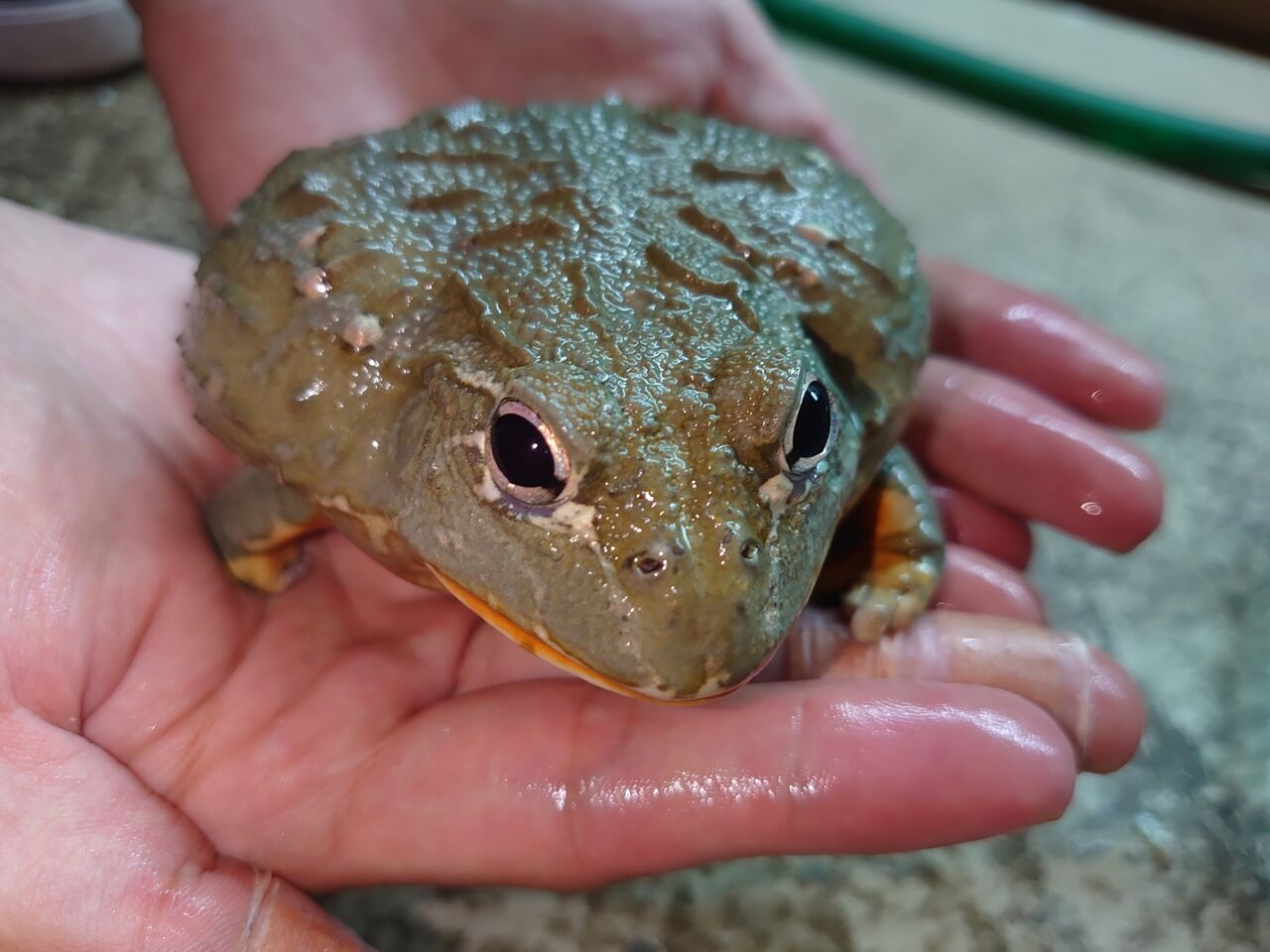 アフリカウシガエル入荷 2021年09月18日 ヤングサイズ入荷しました。このサイズはすでに迫力があります。ぼてっとしたフォルムに可愛い顔大きくなるカエルです。1匹は注文分なので残りは1匹お探しの方は問い合わせお待ちしております。