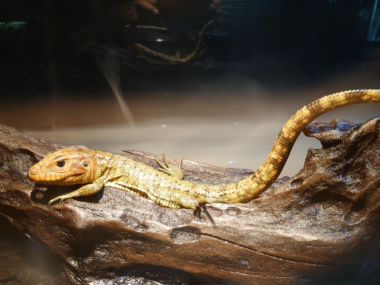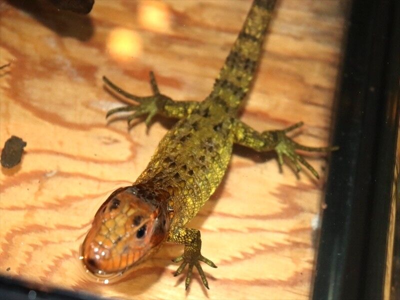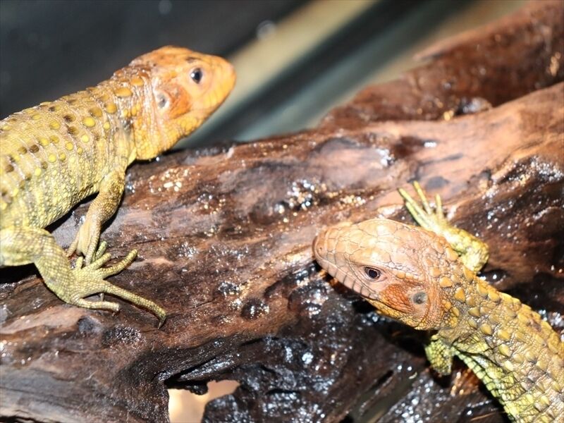 トカゲ類の爬虫類は2階に展示していますが、カイマントカゲは水換えがしやすいように1階に展示しています。