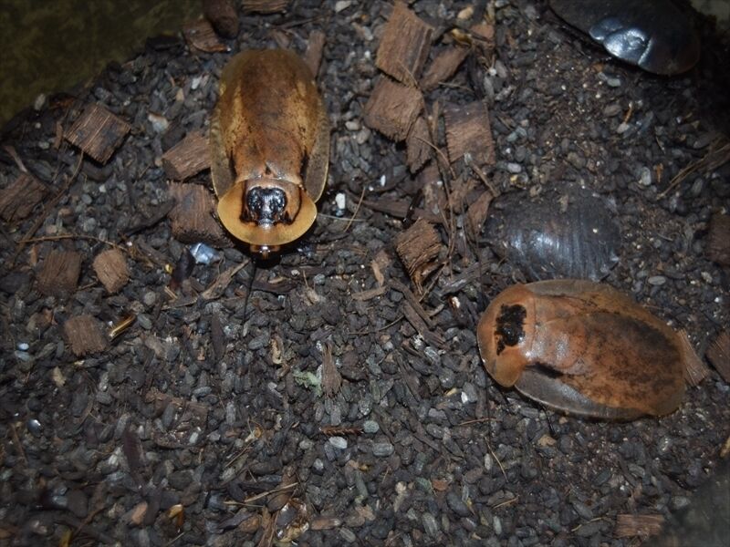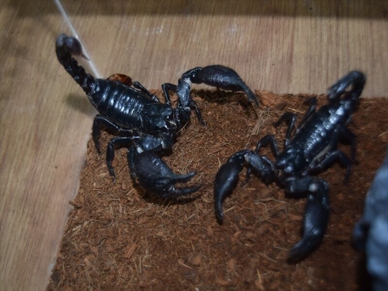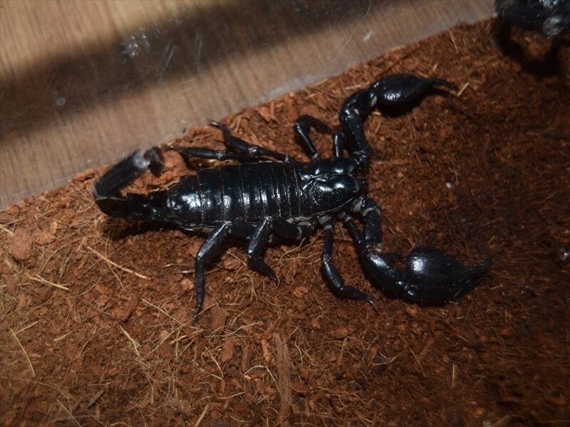 サソリ入荷 2022年07月30日 デザートヘアリースコーピオンペア乾燥系の代表的なサソリ毒性は強いので脱走には気をつけましょう。アジアンフォレストスコーピオン(チャグロサソリ)こちらもペアサソリ飼育の入門種として有名です。上のデザートヘアリーと違い、こちらは多湿な環境を好みます。黒々とした艶がある体に大きなハサミカッコいい写真を取り忘れましたが、小型のサソリ ヤエヤマサソリも入荷しています。ジャイアントウッドローチ成虫は8〜9cmあります。ちなみに羽根はありますが飛びません。まだまだ入荷生体の紹介は続きます。